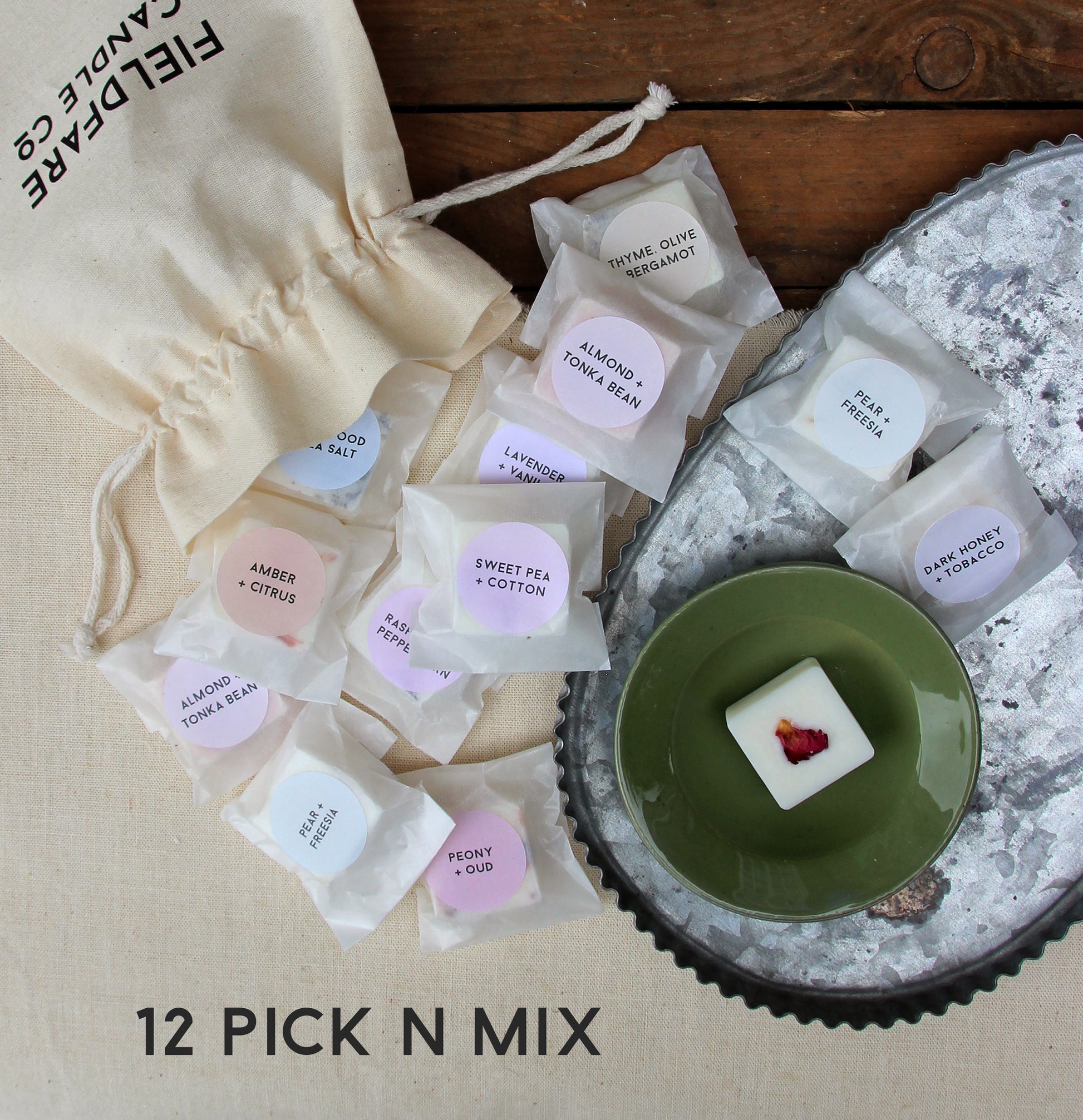 Choose any 12 of our fragranced wax melts decorated with botanicals. Each wax melt will give you at least 10 hours of fragrance when burnt with 4 hour tealights, and your wax melts will come packaged in a printed drawstring canvas bag.
