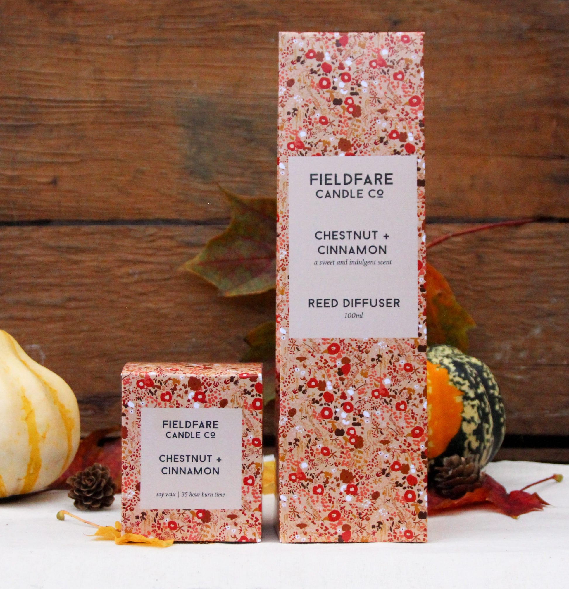A sweet and cosy blend of cinnamon and roasted chestnuts underscored with caramelised sugar and vanilla. The quintessential scent of festive baking. Comes beautifully packaged in a patterned card box so perfect for gifting.