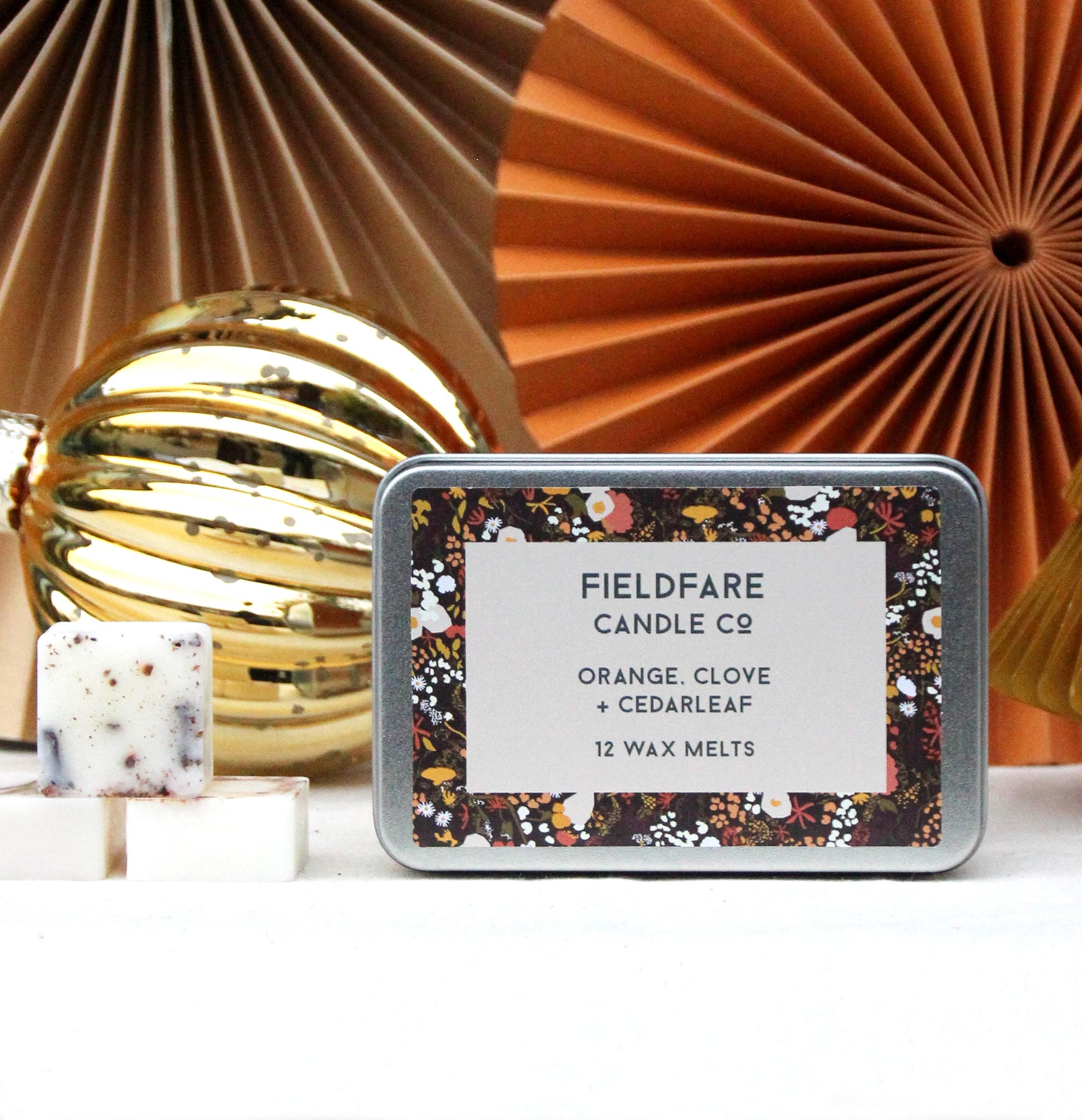 Box of 12 wax melts, with 8-10 hours fragrance per wax melt, packaged in a kraft box and wax paper.